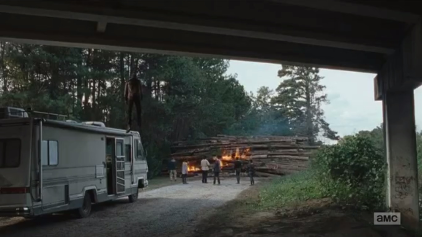The RV group, now on foot, finds a barricade, indicating, as Abraham puts it, that they’re in shit creek with their mouths wide open.  Then the injured man from before is tossed over the overpass while hanging from a chain.  Rick advises Aaron not to fire since they’ll need the bullets for later.  So they leave the man to struggle and die.