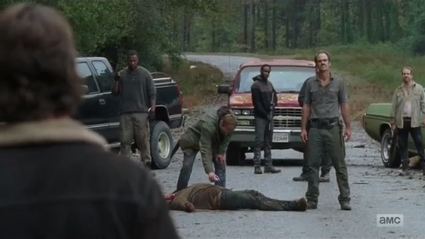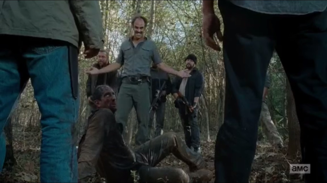 The Saviors, meanwhile, drag the runaway man to the road.  The presumed leader of the group, played by Steven Ogg, is ready to make an example of this man.