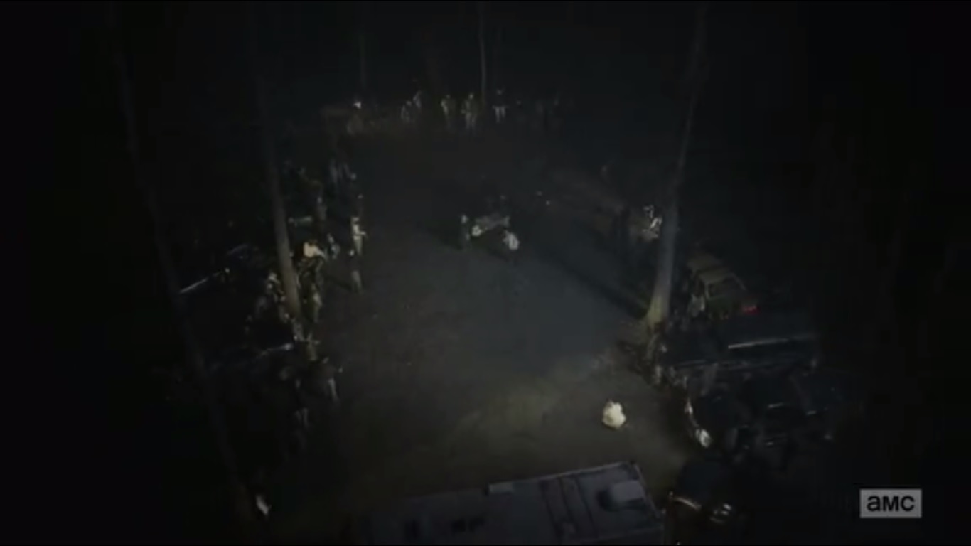 But then they hear a familiar whistle.  With no way to tell where it’s coming from, the group starts running through the woods at full speed until lights hit them dead on.  They end up in an open area, surrounded by Saviors all around them.  If that wasn’t bad enough, the Saviors managed to capture Eugene and the RV as well.