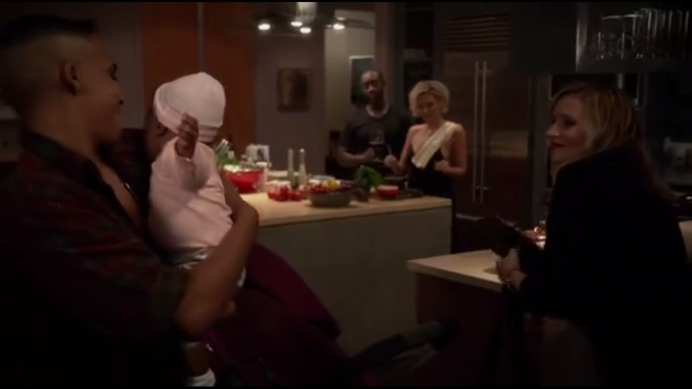 At home, Roscoe’s selfie instantly gets 207 likes, while Marty’s gal pal, Klare, played by Nicky Whelan, cooks a Vegan meal. Roscoe argues that you can’t live a healthy Vegan lifestyle if you drink. You see, he subscribes to the Straight Edge philosophy. Jeannie pops by with the baby and takes a few questions from Klare. She’s just being friendly. After all, female friendship is the new Black. What? Anyway, Jeannie has plans.