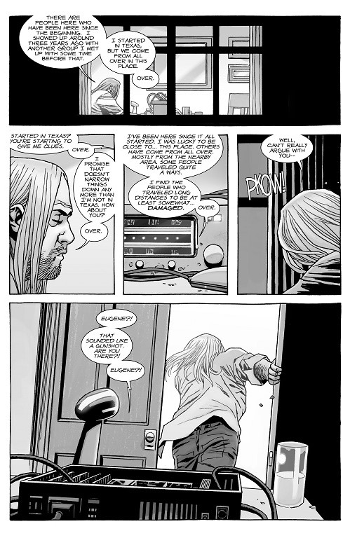 Briefly on Eugene. His radio conversations are going to have a big impact, I’m guessing, if just by Eugene giving information about himself, while his companion remains in the dark about their position since the outbreak, which is apparently just one place. This person says that they find people who traveled long distances to be somewhat damaged, which I find interesting. It doesn’t reveal a lot, but something to think about for later.