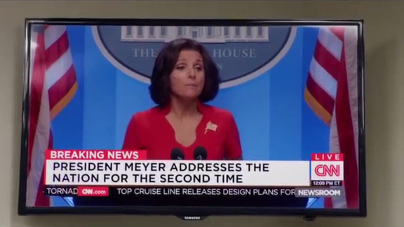 The season begins the day after the vote. Still no decision, but no matter. As she addresses the nation, Selina Mayer stands in barefaced awe of the nation’s democratic system. Right. It’s a tie, but she won the popular vote and the nation only attempted to pick a leader. She says that the country is not without a leader. No matter how the nation voted, she is still currently the President.
