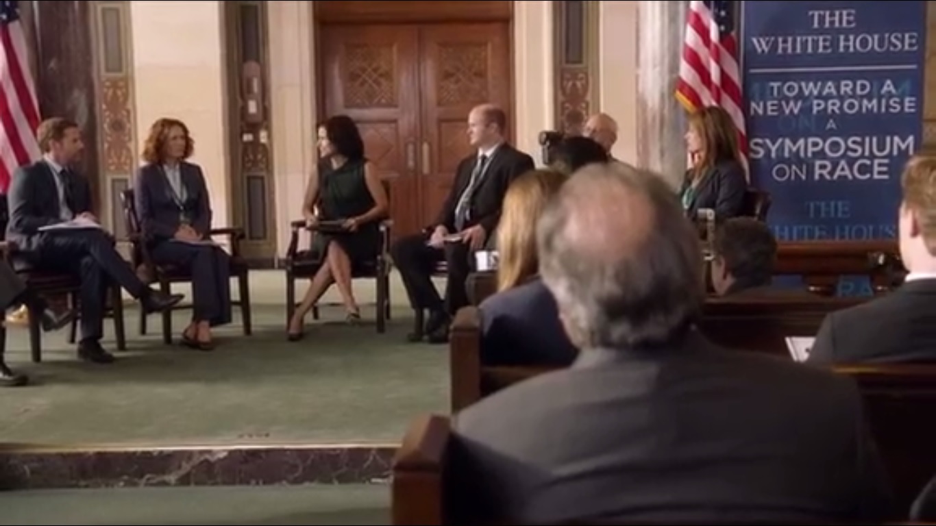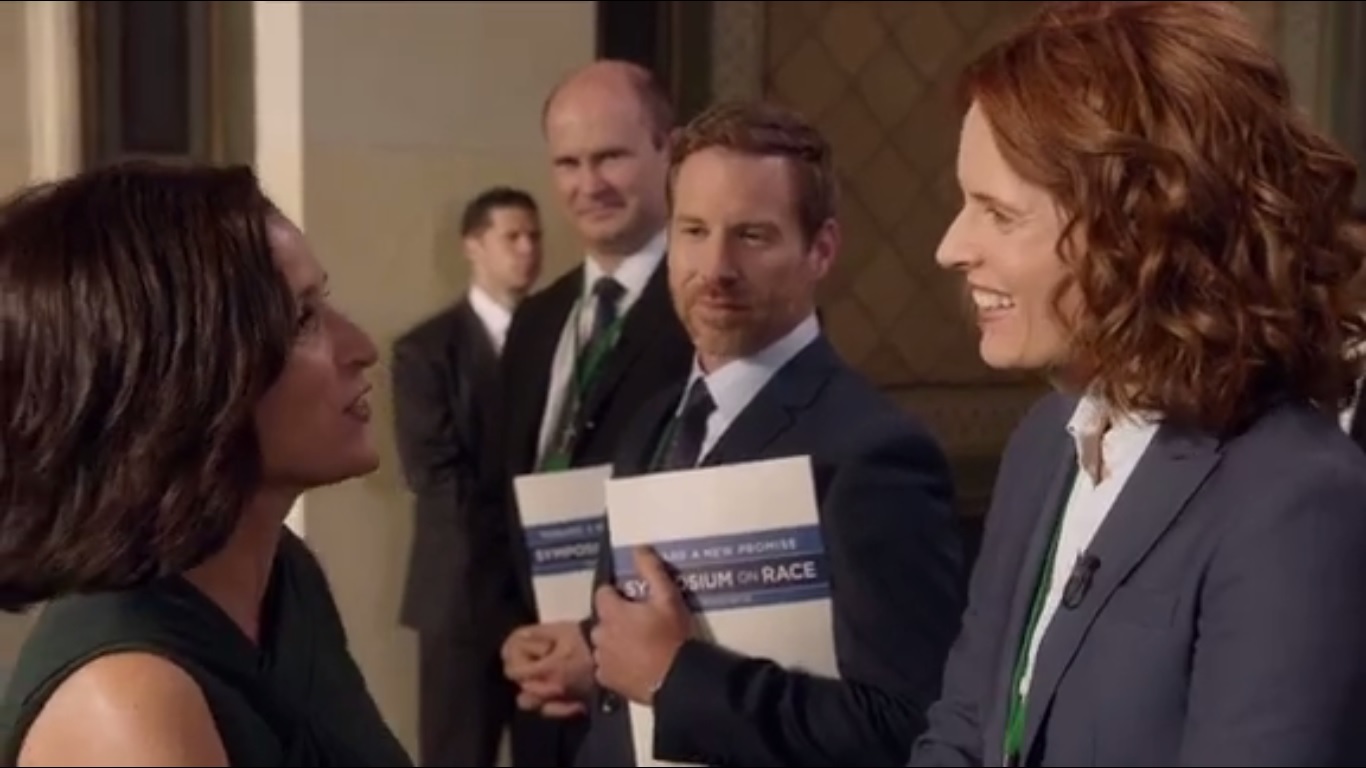 In Veep fashion, the symposium ends up being Whiter than the audience at a hockey game and security trains their guns on Sue, thinking she’s the culprit of the alarm. And in the subsequent press conference, Mike is asked whether Selina cares about Black people.