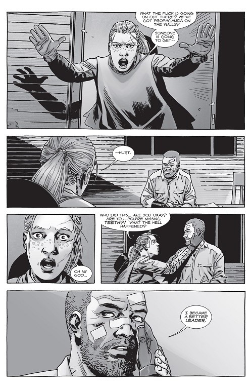 Even though he’s outnumbered and, to my knowledge, hasn’t faced the Whisperers before, he’s cracking jokes and talking shit to this new character, Beta. Saying this and watching the Negan we got on the television show aren’t enough, though. I’d suggest picking this issue up and seeing Negan at his finest.