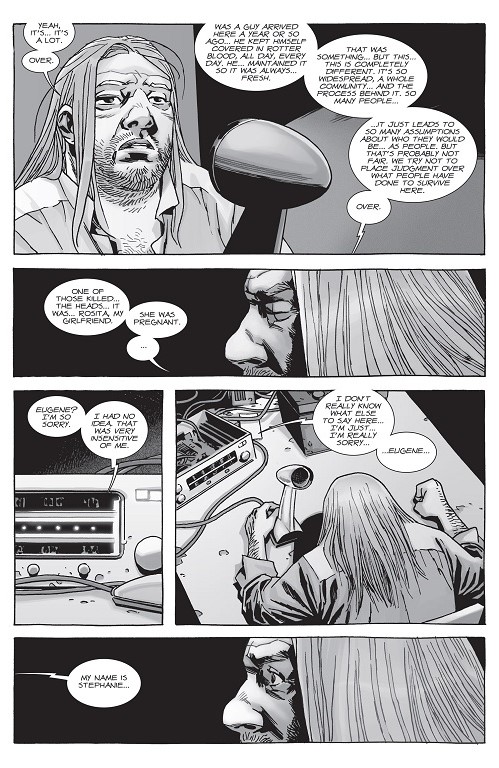 But Eugene has a personal stake in this due to the death of Rosita and her baby, and I like how this personal impact is what gets Stephanie to open up to him a bit more. I get that Stephanie, like Eugene, is wary, but strange that it took mentioning a girlfriend’s death to convince her to finally say her name.