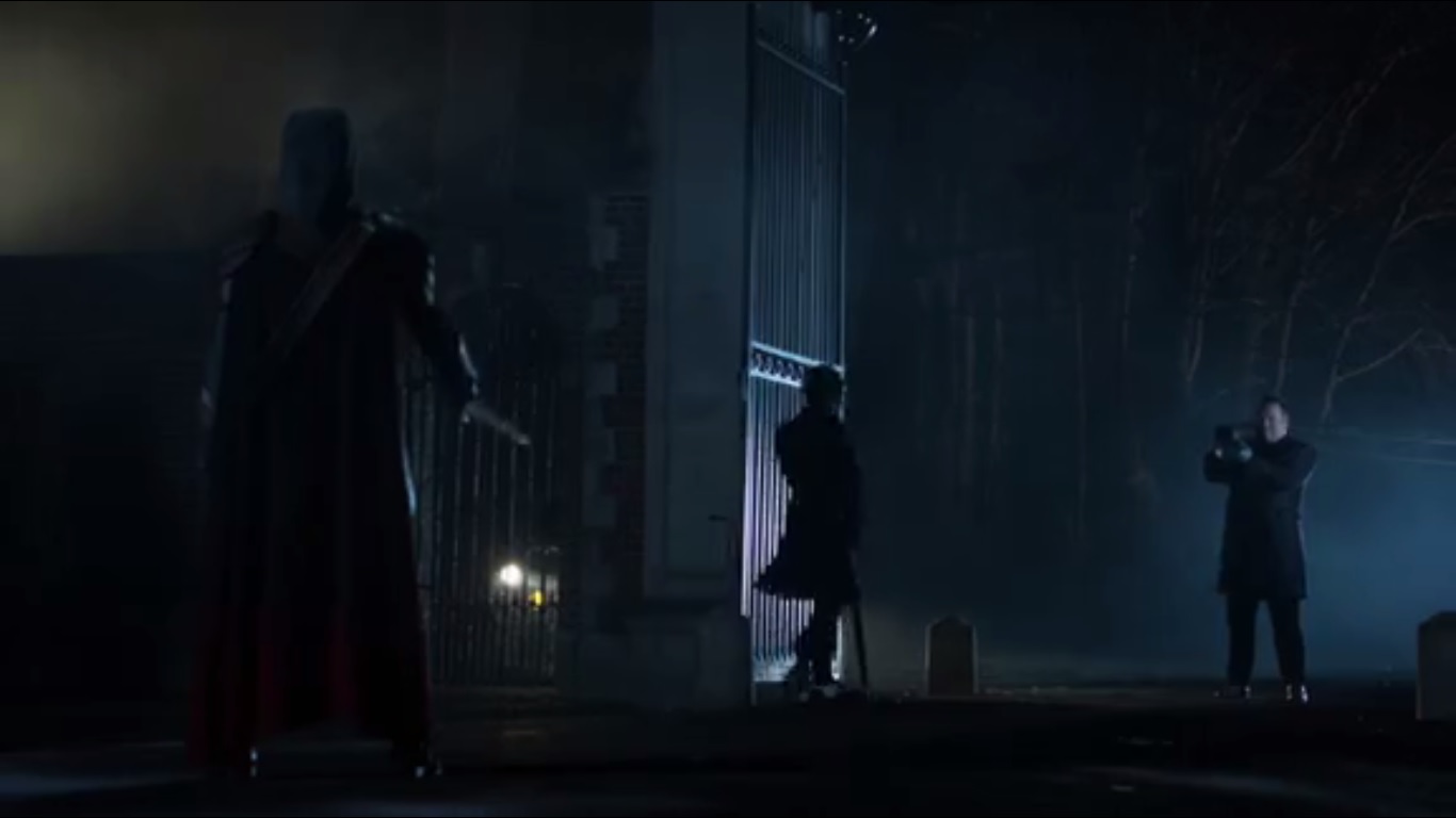 At Gotham Cemetery, Tabitha, Bullock, and Gordon arrive at and enter the Galavan crypt. Bullock is creeped out by the act of grave robbing, but like he said: whatever it takes. So this is where Harvey draws the line. The two remove the slab and find the sacred sword.