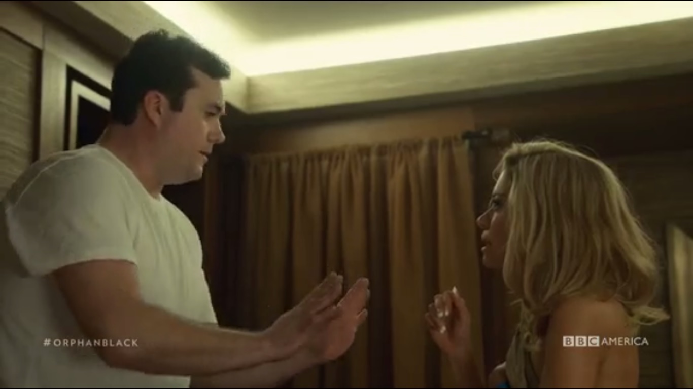 Cosima and Alison discuss an upcoming Brightborn orientation. Sarah is busy with family and Alison is busy, so Cosima offers to infiltrate Brightborn. Great. Donnie will pick her up. In fact, he’s already dressed and ready to go. Donnie thinks the baby is important for the role, but Alison disagrees.