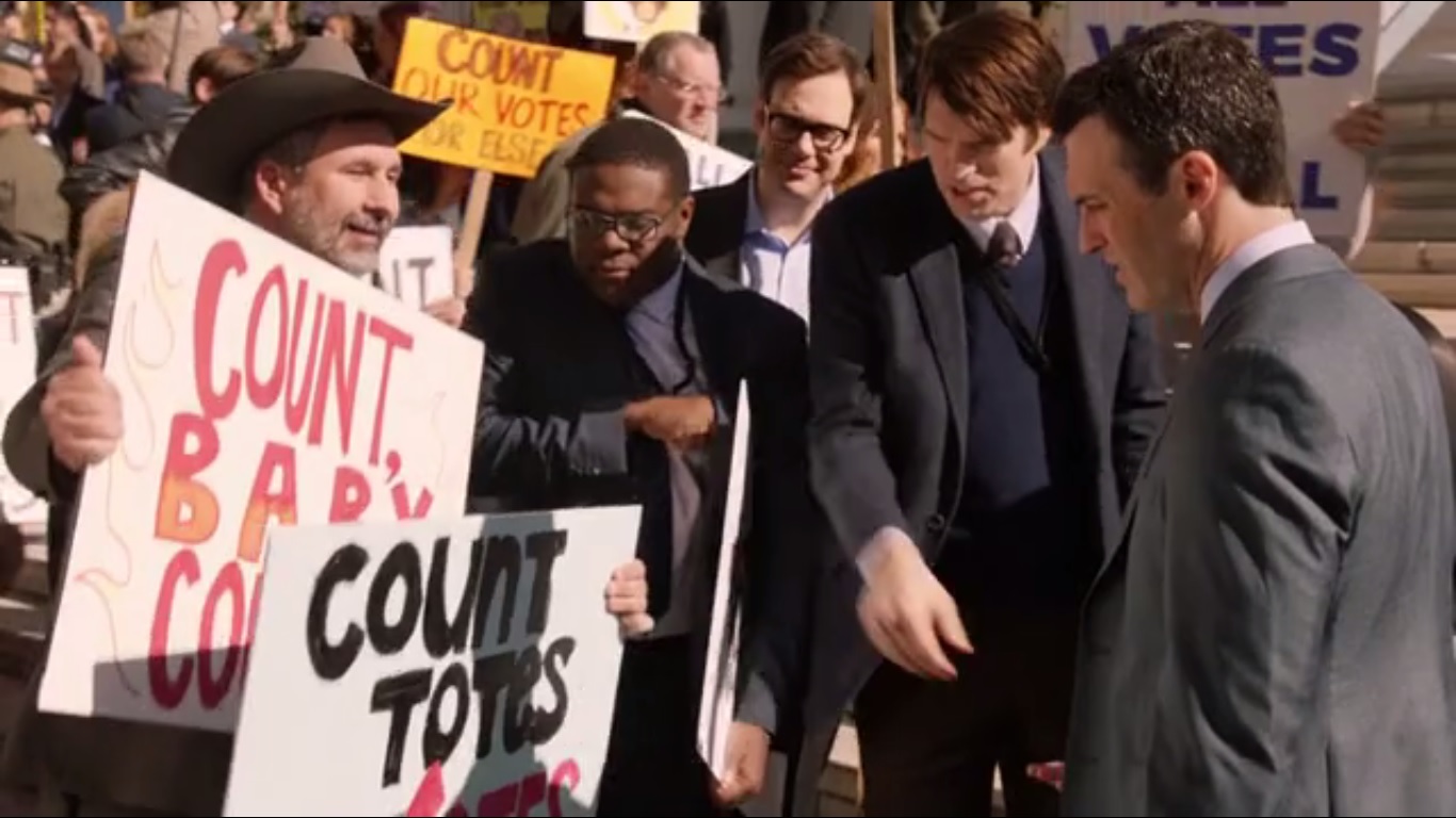 Then we get a ballot hearing in Nevada. The Meyer and O’Brien camps make their case, though Karen somehow manages to find a way to stall out the process of a deadline. Outside, Dan and Amy find a protest that they discern to be fake.