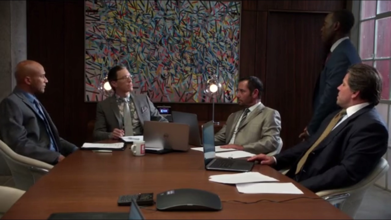 As Devin takes a call, we get another time freeze. Marty explains that Devin is CEO of Planet Curl and soon-to-be head of Delcour’s Planet Curl division. The pod speaks on Devin’s behalf, saying that he grew Curl to $70 million in sales alone last year. However, Jean-Michal, played by Jonathan Kells Phillips, tells Marty that Delcour just wants a deal right now.