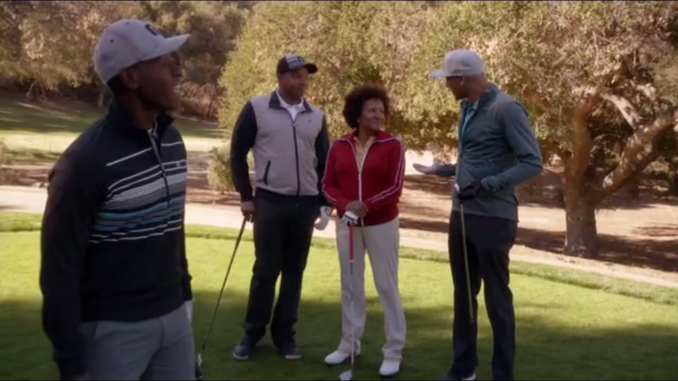 So on the golf course, Devin and Donald Faison play with Marty and Rita. Marty asks if Rita ever saw The Color of Money. If she’s going to hustle, she needs to start making shots. Devin offers to skip the Delcour deal since he can make more money playing golf. Donald asks Rita for a recommendation on a hair salon for his wife. Devin, though, says it depends on the texture of the hair.