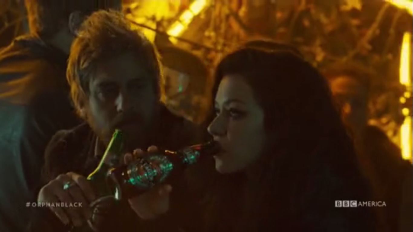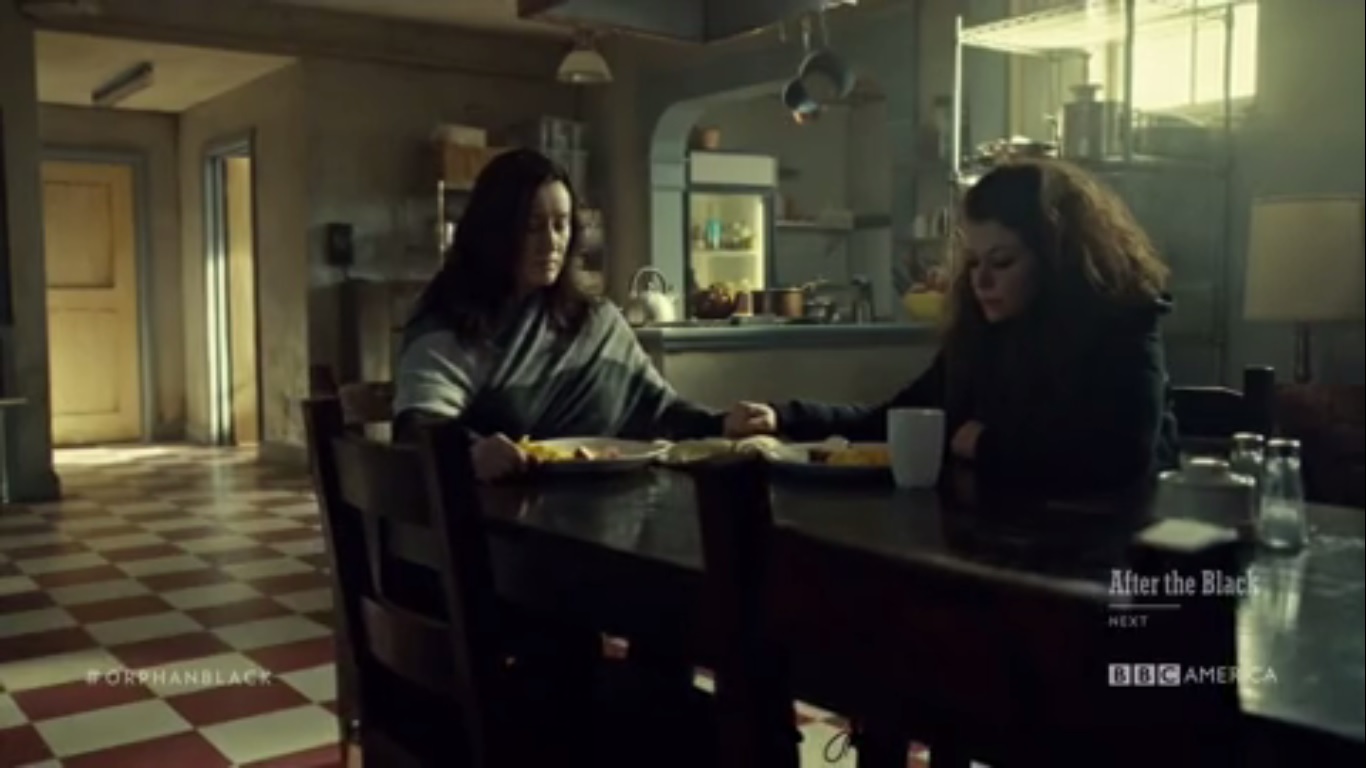 Cosima and Scott examine the bot, comparing Sarah’s DNA pre and post-bot. In what I think is a very daring, yet stupid move, Cosima is willing to take the risk of implanting the bot into her own mouth. Food arrives, but Cosima locks the door and heads back downstairs.