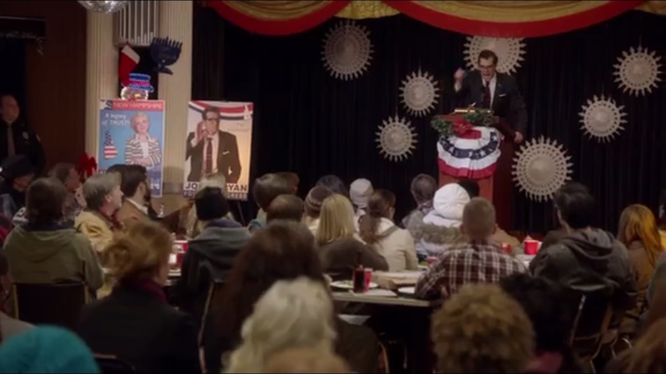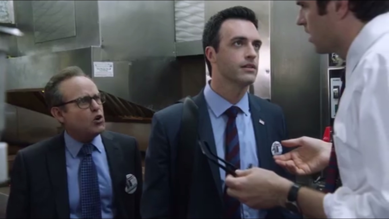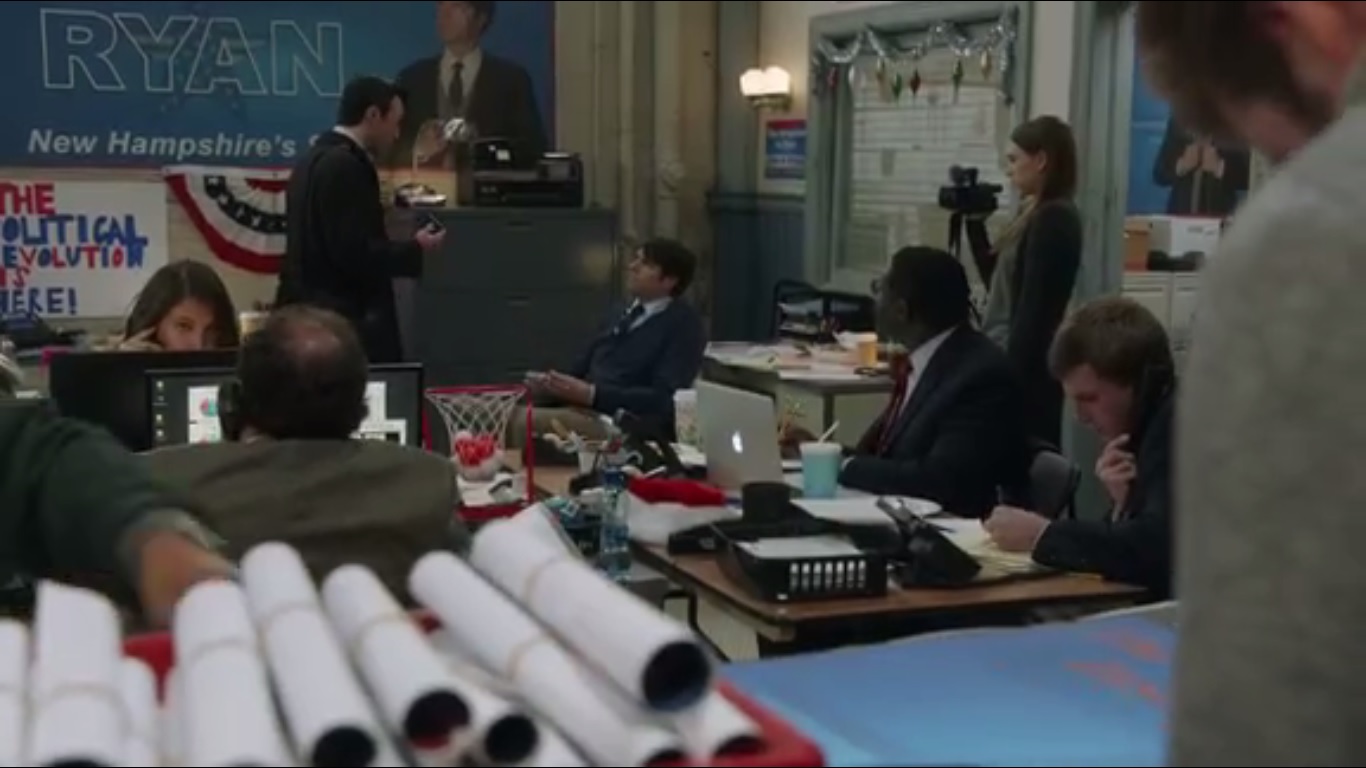 At the Ryan for Congress HQ in New Hampshire, Jonah speaks dramatically while Catherine records B-roll. As Director of Communications Richard receives copyright claims from bands featured in Jonah’s ads, Dan shows up enters and declares himself as Jonah’s campaign manager. He immediately takes charge and tells Jonah that he answers to him, now. Dan also takes Jonah’s office.
