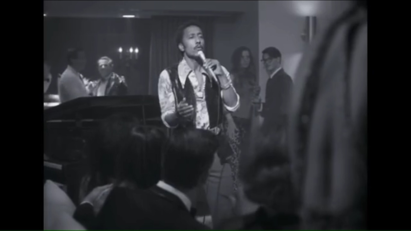 Also at this party is Sammy Davis Jr., played by Andre Royo, who takes the mic and breaks into song. He messes up a bit, so that’s a cut. Hugh brings Bill and Virginia over to get some publicity stills of the two dancing.