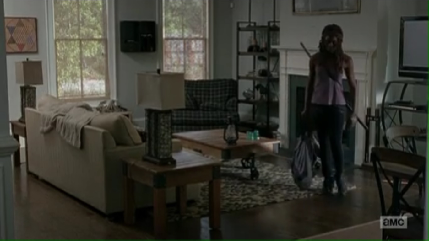 The episode begins in Alexandria as Michonne awakens before Rick does. As she’s ready for the day, with her sword on her back, she retrieves a sniper rifle from the fireplace. No one ever thinks to check the fireplace. She stuffs the gun inside a bag and exits without saying a word to Rick, who watches her leave.