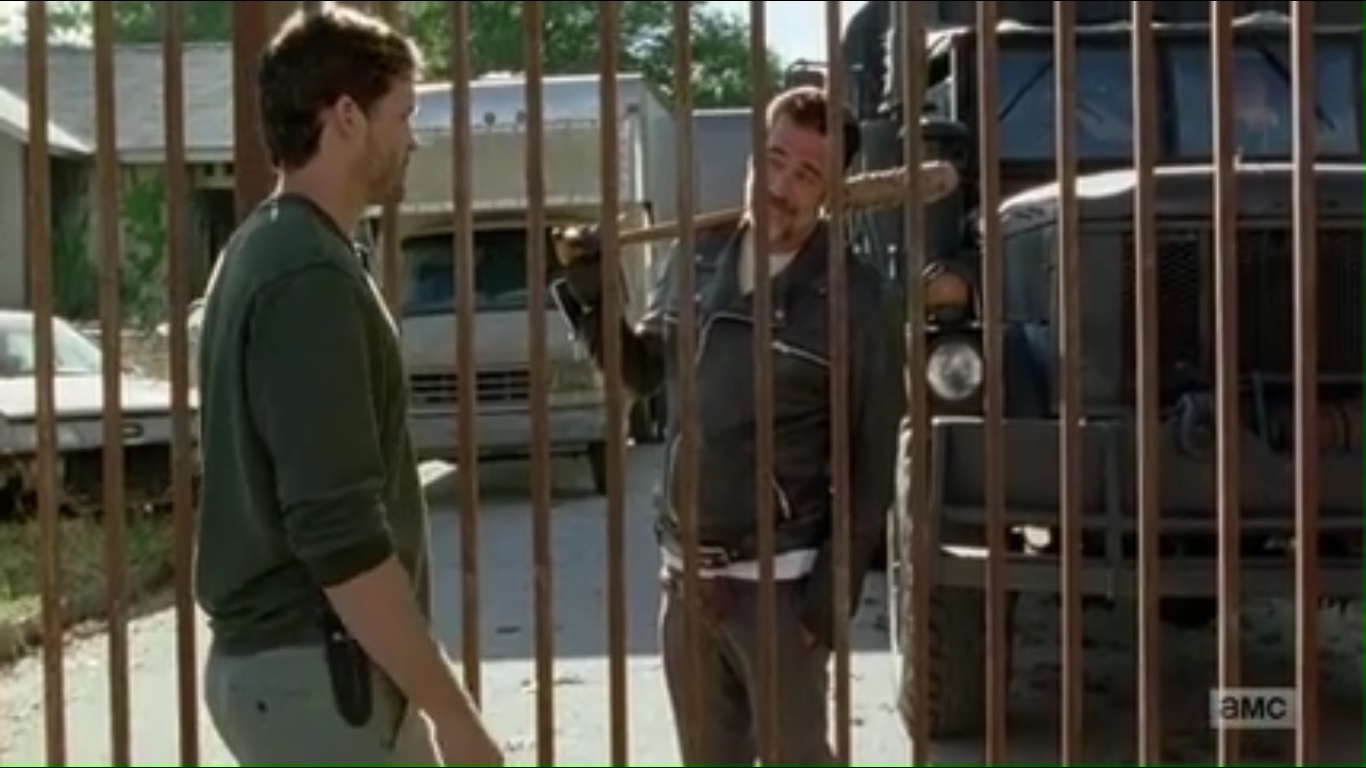 The sound of many approaching vehicles gets their attention. From the other side, Negan marches up and bangs on the gates of the Alexandria Safe Zone, demanding entrance. Spencer isn’t familiar with Negan, but then Rick arrives. He’s hesitant to open the gate at first since Negan has arrived earlier than expected, but Negan just missed Rick. Negan then makes quick work of an approaching walker for the sport of it.