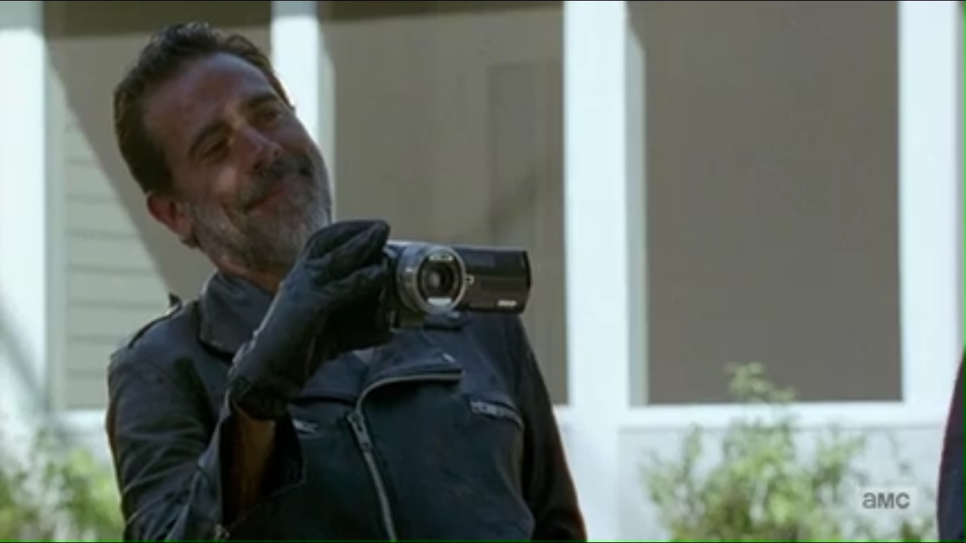 As the Saviors get to work taking what they want, Negan tells Rick that he and his people are indeed reasonable people. One Savior gives Negan the video camera containing Deanna’s video interviews. Negan finds it hard to believe that Rick had such a beard and never would have messed with that man. As he turns the camera on Rick, Negan says that the Rick on that interview isn’t the Rick that stands before him.