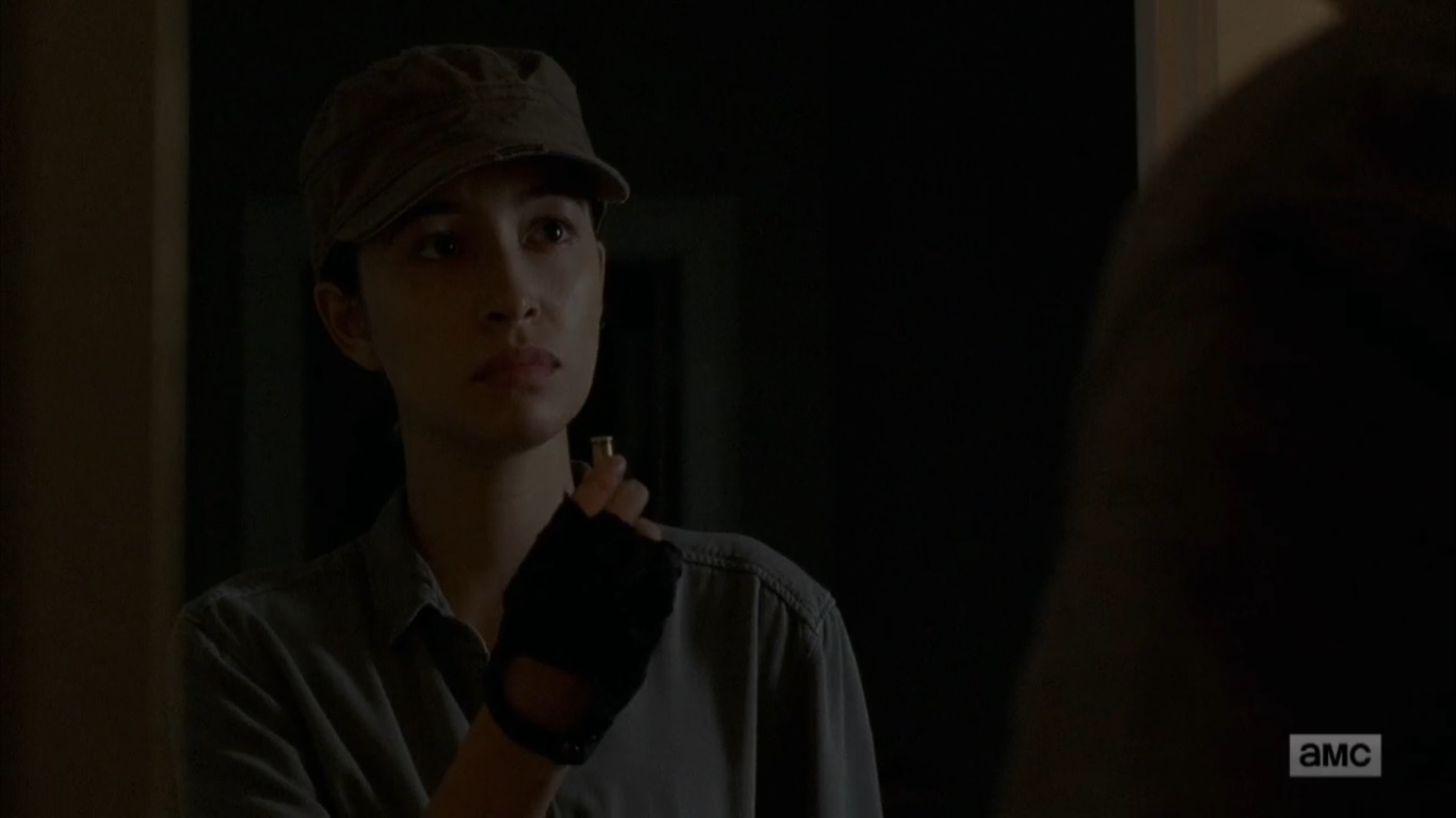 That evening, Rosita, after coming across a shell casing, comes to Eugene and asks him to make her a bullet.