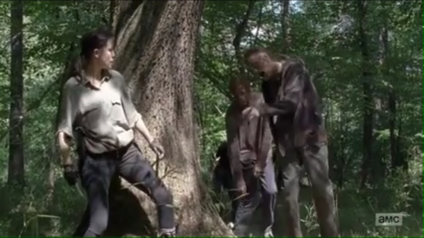 Back in the field that time forgot, Michonne spots an approaching walker, but misses with every shot that she takes. So she takes out her sword and does this the old fashioned way. Could’ve saved yourself a lot of bullets, Michonne. She later heads into the woods and finds a dead deer on the ground.