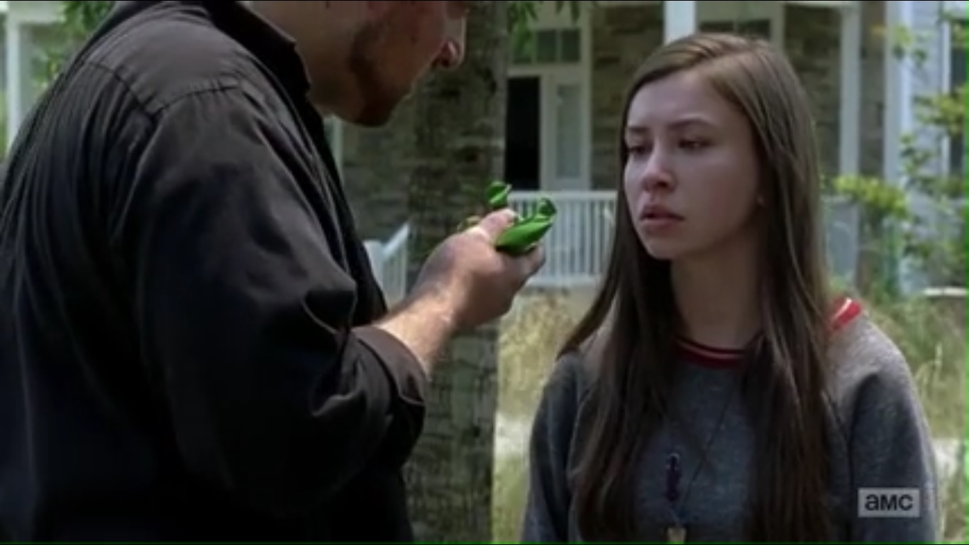In a bit of an uncomfortable scene, another Savior relieves Enid of her balloons and tells her to say please if she really wants them. When Enid complies, the Savior returns them. Well, he drops them. Carl doesn’t like this shit one bit, but Rick assures his son that the Saviors will be gone soon.