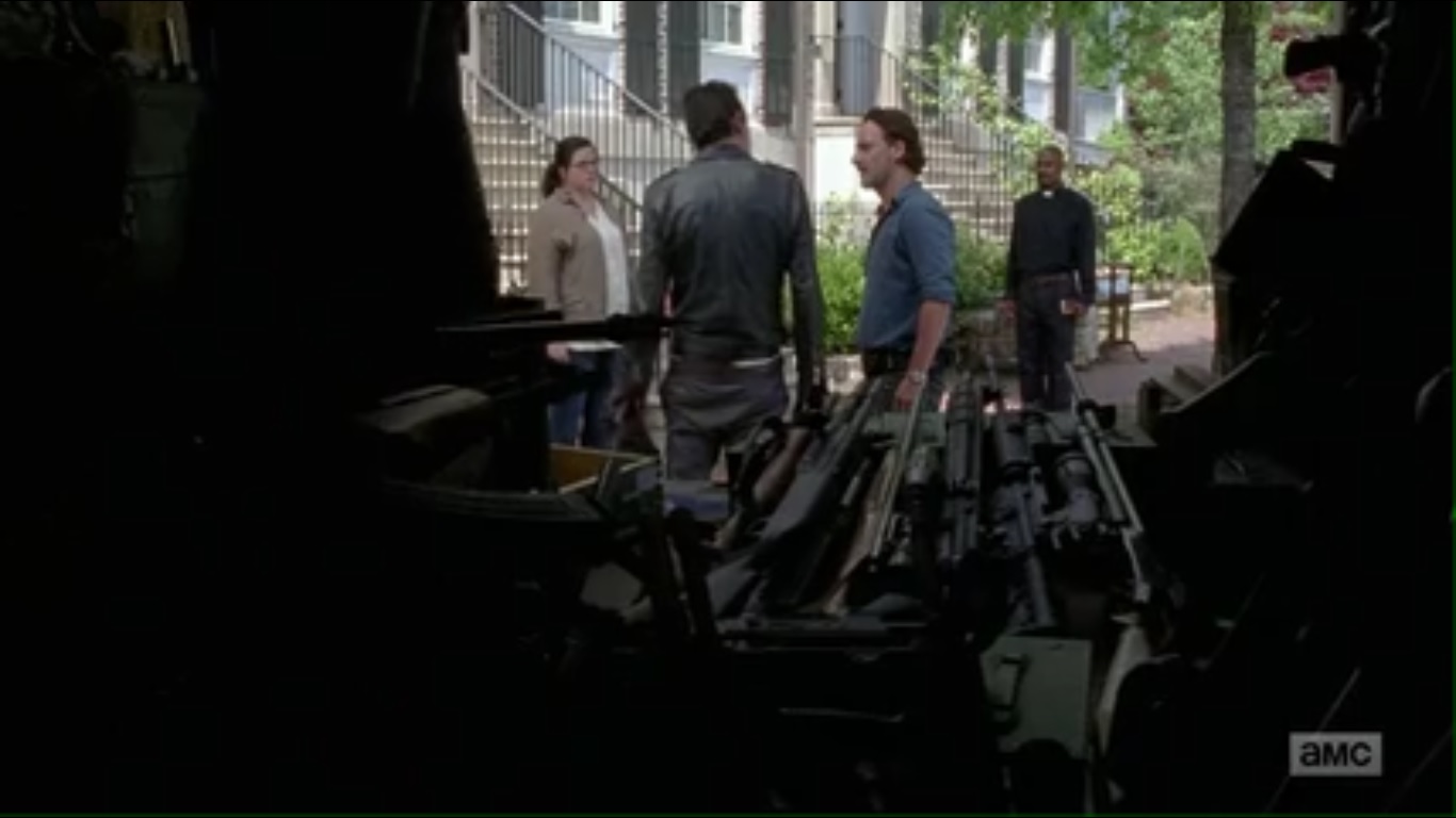 As the Saviors load the guns, Negan picks up one to find out if Rick has taken care of his guns…and finds out by firing into one of the windows. Then another Savior brings out the rocket launcher- the same one that Daryl used to take out some Saviors on the road.