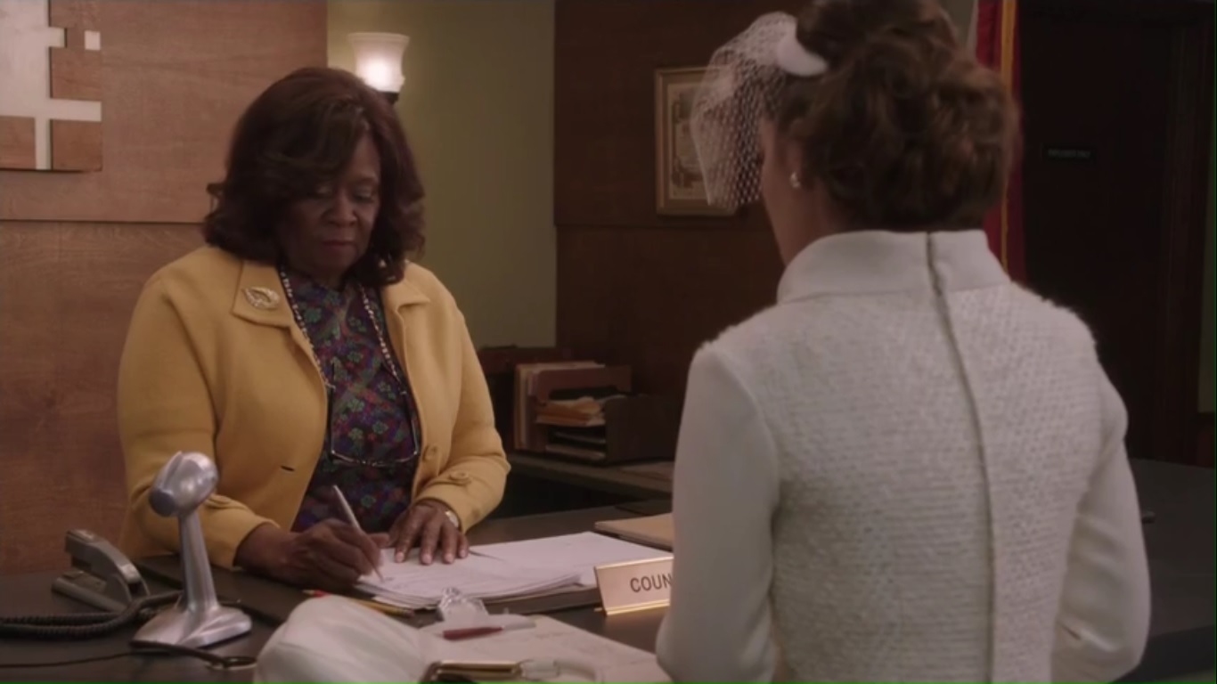Whatever. Anyway, Virginia arrives at a court building to check in for the wedding, but she can’t do that since both parties aren’t present. So the court clerk, played by Aloma Wright- hey, it’s Laverne from Scrubs– tells Virginia to have a seat.