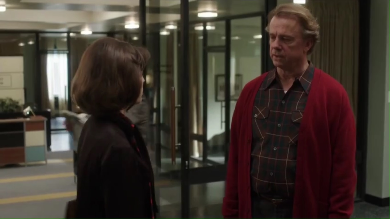 At the clinic, Bill and Virginia talk with Bob Drag about their work and his supposed loyalty to them, based on his deal with Art and Nancy. Bob maintains that Art put in the work, but he’s not a known entity in the publishing world. Point is that Masters and Johnson are a household name and, as Virginia says, their book on homosexuality would chronicle the homosexual transition. As in conversion. And Bob doesn’t like that. Neither does Bill.