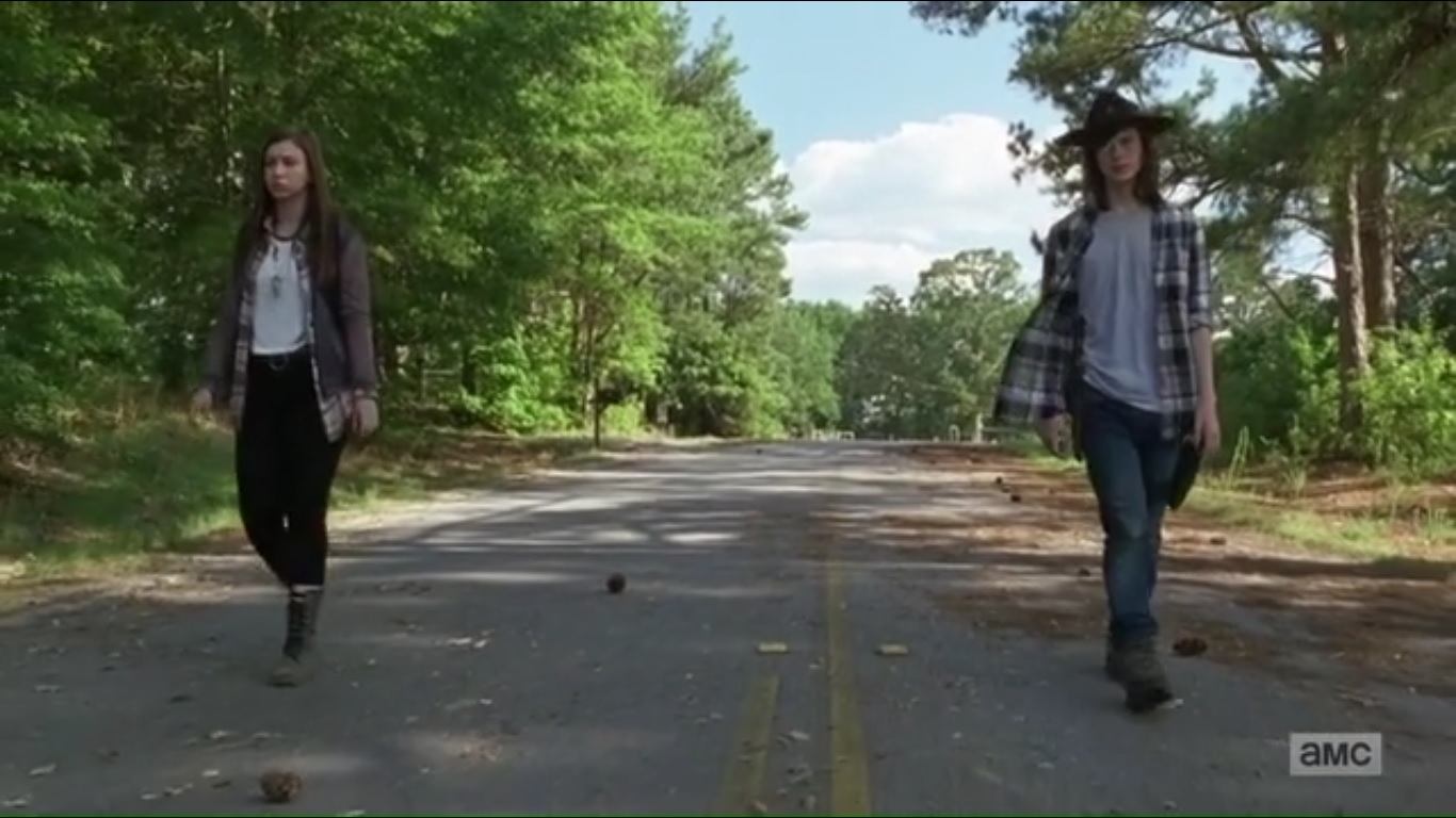 The next day, Carl and Enid, now on foot, talk about killing for the ones they love. Carl counters that it’s not for them and he apologizes for locking her in the armory. Enid is still concerned about Maggie.