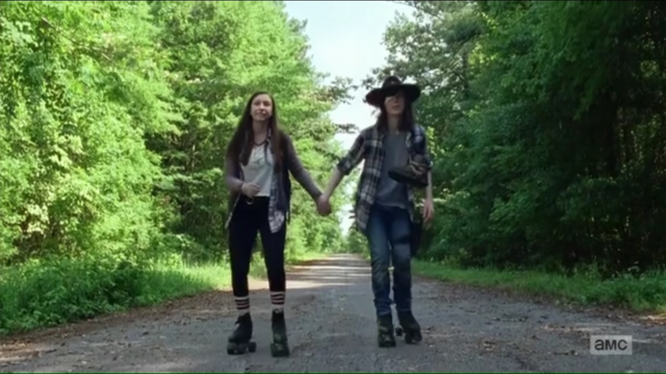 Back on the road, Carl finds a backpack that actually contains two pairs of roller skates that miraculously fit both him and Enid. Now what are fucking odds of that? The two join hands and skate down the road like something out of a 1980s movie.