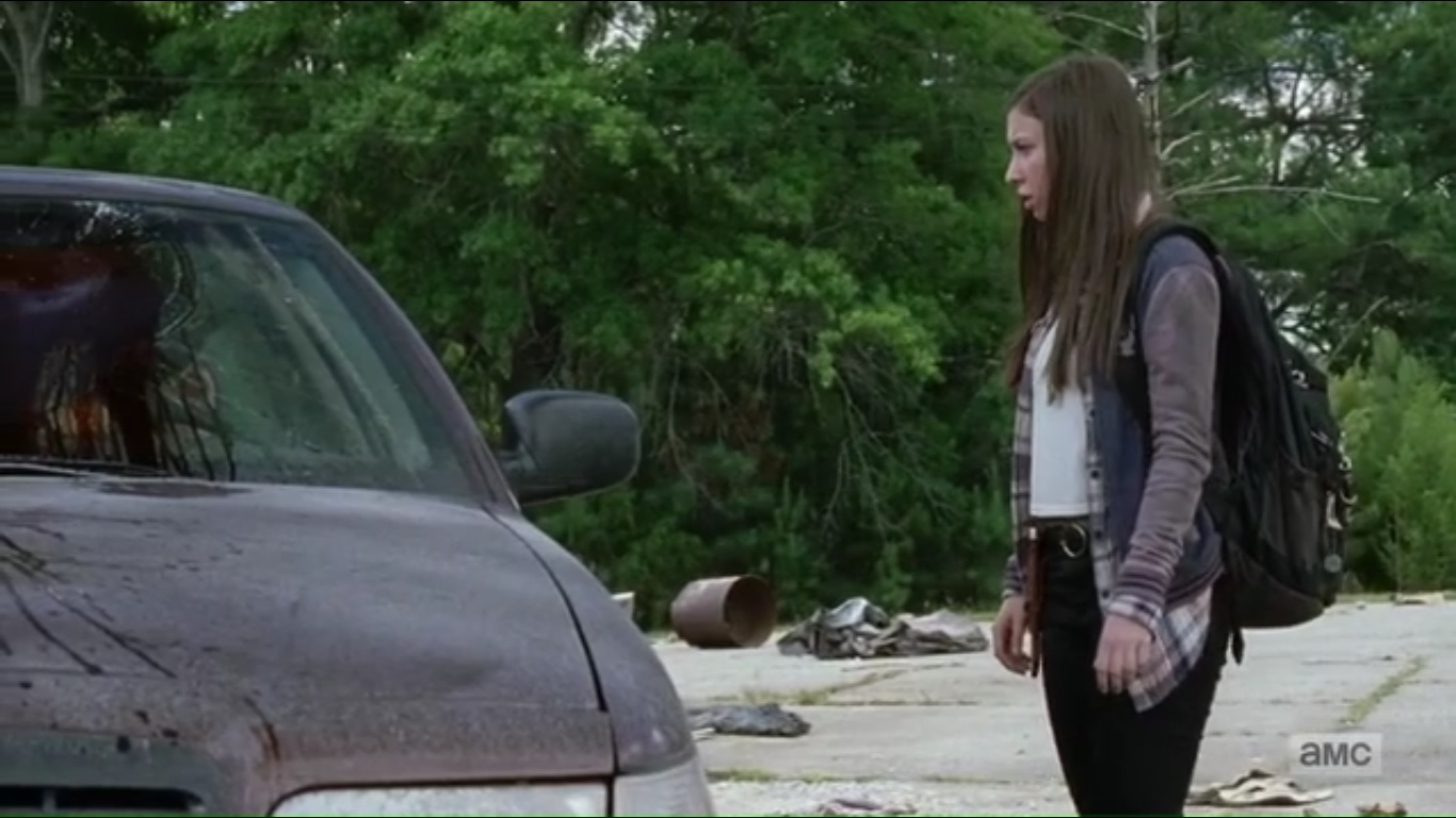So Enid finds a bike and spots a walker approaching her. It’s soon decimated by an approaching car that quickly crashes into a post. The driver backs up and slams the walker into a wall. Turns out that it’s Carl, who tells Enid that he likes to drive. I don’t see how. He’s a worse driver than Lori.