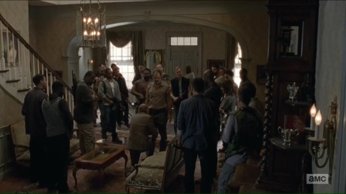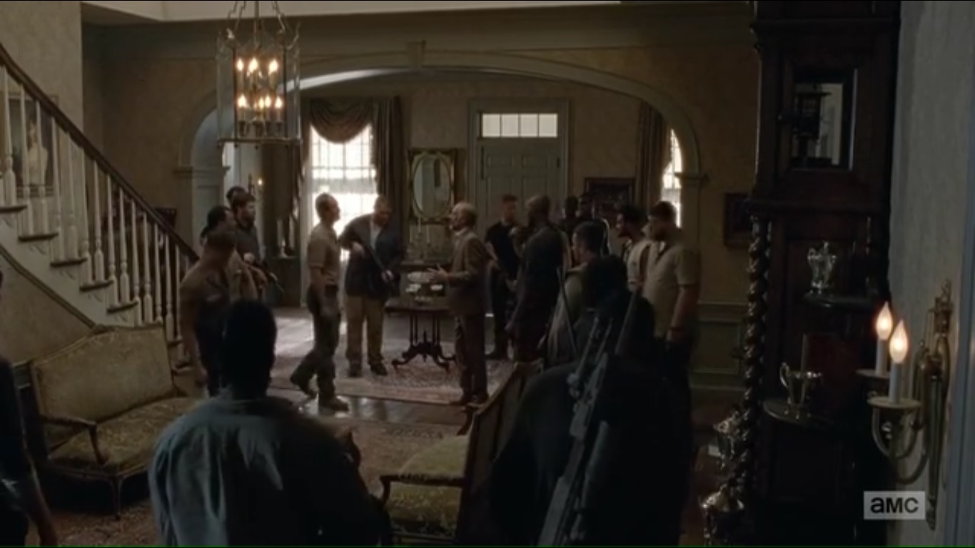 The Saviors enter the mansion with Simon surveying the place. He tells Gregory that the two of them need to talk in his study. See, Simon wants to see Gregory’s painting. He then brings up that the Saviors that Gregory used to deal with have been removed from play, hence the need to talk.