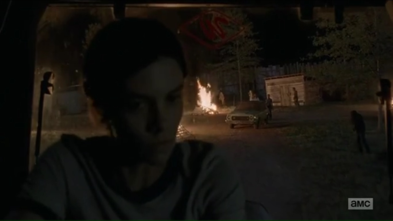 That evening, Maggie and Sasha hear whistles, music playing, and spot fires across the Hilltop. With the windows locked, Sasha slips out on top of the trailer just in time to spot walkers streaming into the Hilltop. Maggie alerts Jesus that Sasha needs backup, as well as tells two Hilltop residents to close the gates. Sasha approaches the source of the music: a locked car.