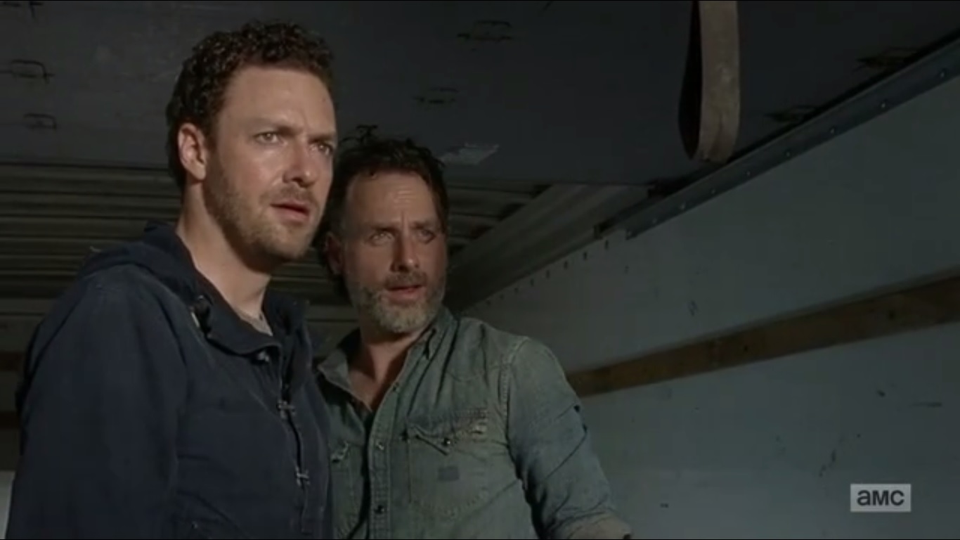 Elsewhere, Rick and Aaron awaken just past 5:30. Rick contemplates radioing into Michonne, but doesn’t. As the two prepare to head out, they make a new discovery.