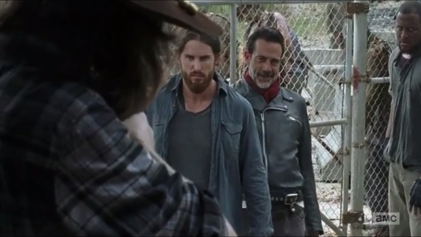 Dwight tackles Carl and confiscates his knife, but Negan orders him to back off. After all, it’s no way to treat a guest. Negan is all ready to give Carl a tour of the place, and Carl eventually relents and takes Carl’s hand. Negan tells Carl that, like Daryl, he’s lucky, as both of their lives and jobs would be tougher with just one hand or arm.