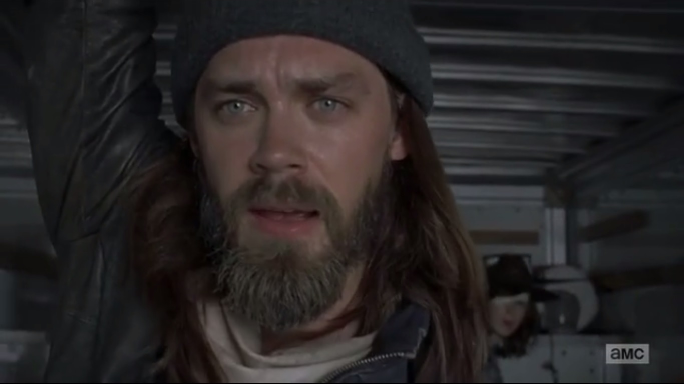 When the Saviors finally depart, they are unaware that Carl and Jesus are also on this truck. While the drive continues, Jesus pours syrup onto the road in order to leave a trail, thinking that they’re close. Jesus wants to bail and follow the rest of the way. The trucks are slow enough, so he and Carl will be in the blind spot and can race behind the other cars.