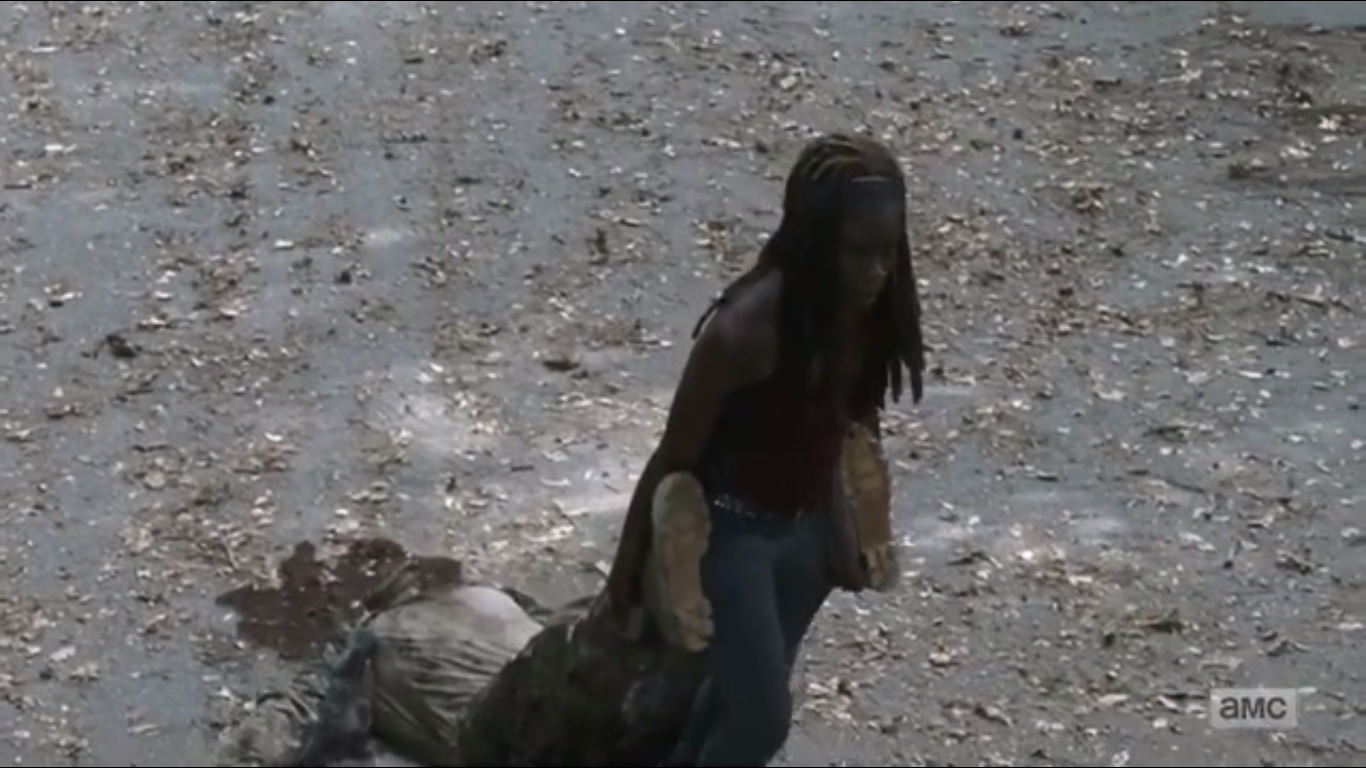 The episode begins with Michonne on the road as she again comes across the burned mattresses. Doing her best impression of Omar from The Wire, she whistles “The Farmer and the Dell,” and soon puts down two approaching walkers. Setting down the radio and her katana, she begins dragging one of the walkers away.