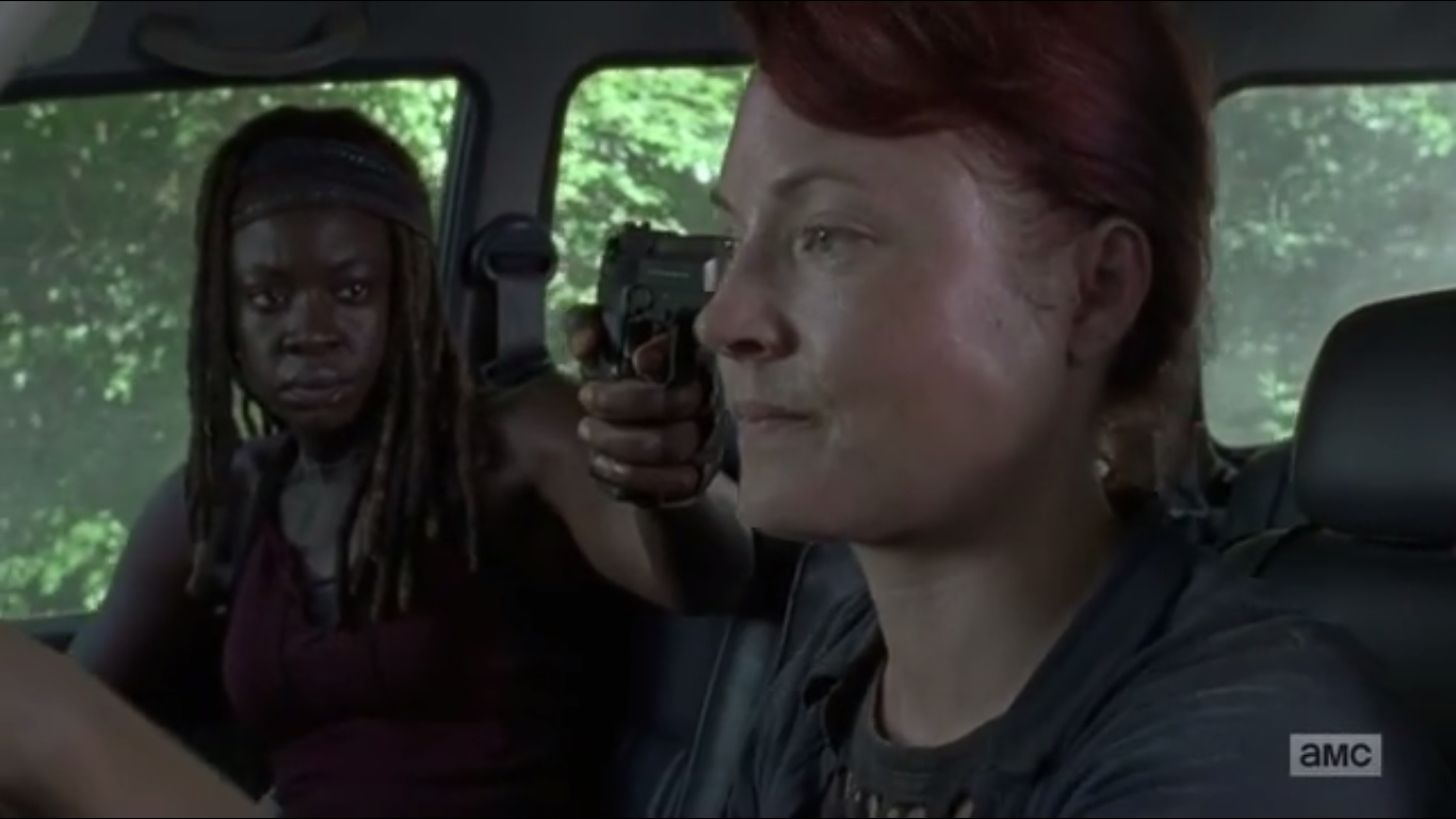 On the road, a lone Savior happens upon a roadblock of corpses when she’s soon approached by Michonne, who orders her to lower her gun and knife. She orders the woman to take her to Negan.