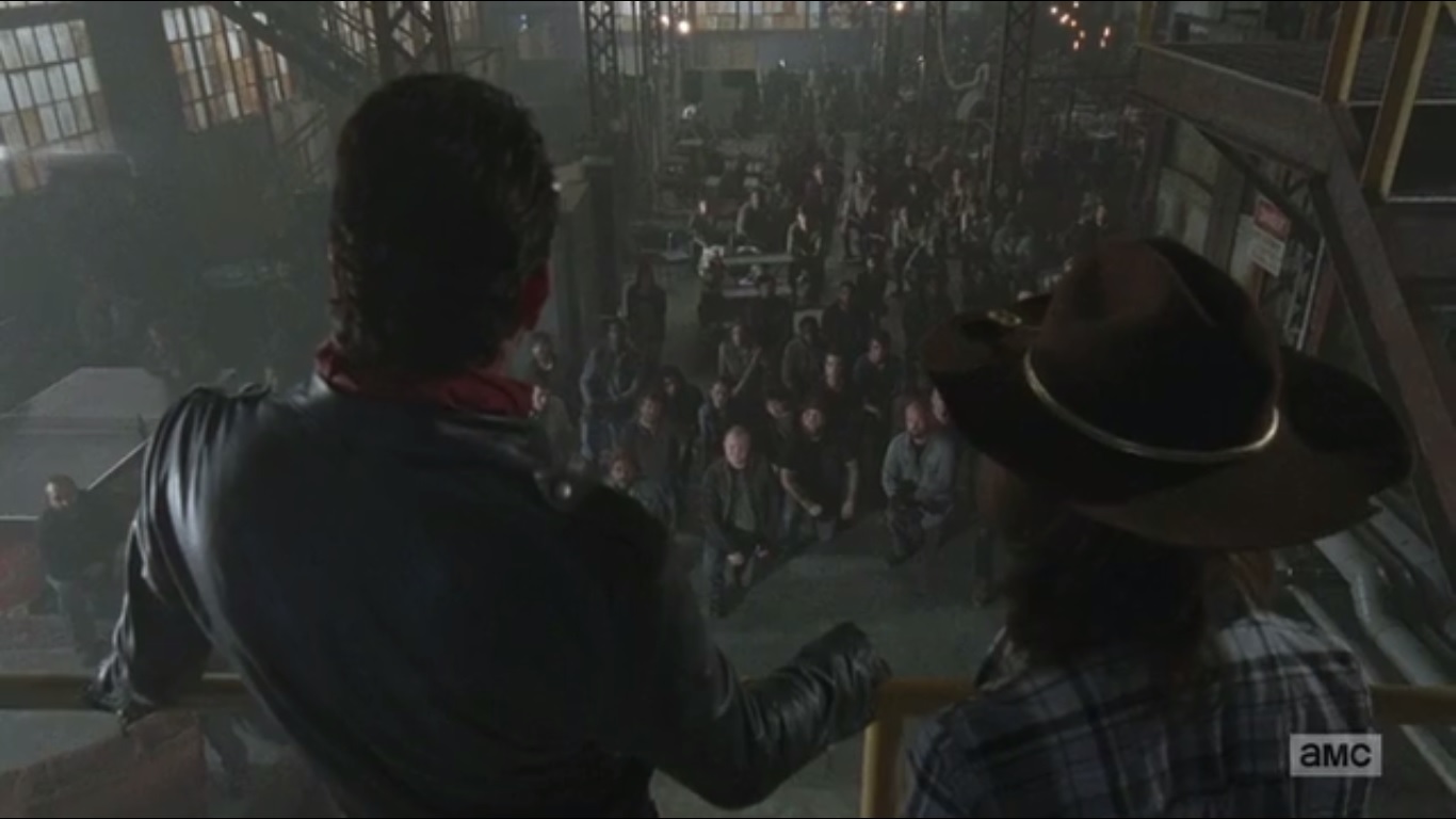 Negan brings Carl inside the Sanctuary, where he greets a waiting crowd of Saviors. He tells his followers that they have gone out into the world, fought the dead, and come back with some good shit. That shit can be theirs if they work hard and play by the rules. As such, everyone, regardless of points, gets fresh vegetables at dinner. Negan tells Carl that this is a sign of respect, as the people are still kneeling.