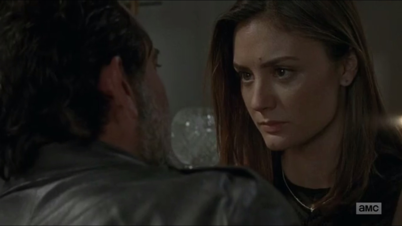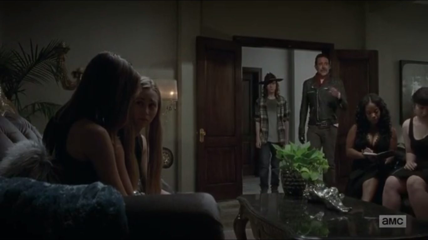 Negan pops by his harem and tells Carl that the women won’t mind if he stares at their tits. He shares a drink with Sherry and wants to know what happened with Amber and Mark, but Sherry says that’s none of Negan’s business. Fair enough, but Negan wants to know if it’s true that Mark skipped out on redirect duty to be with Amber. After all, there are rules for a reason and nothing matters if you’re dead.