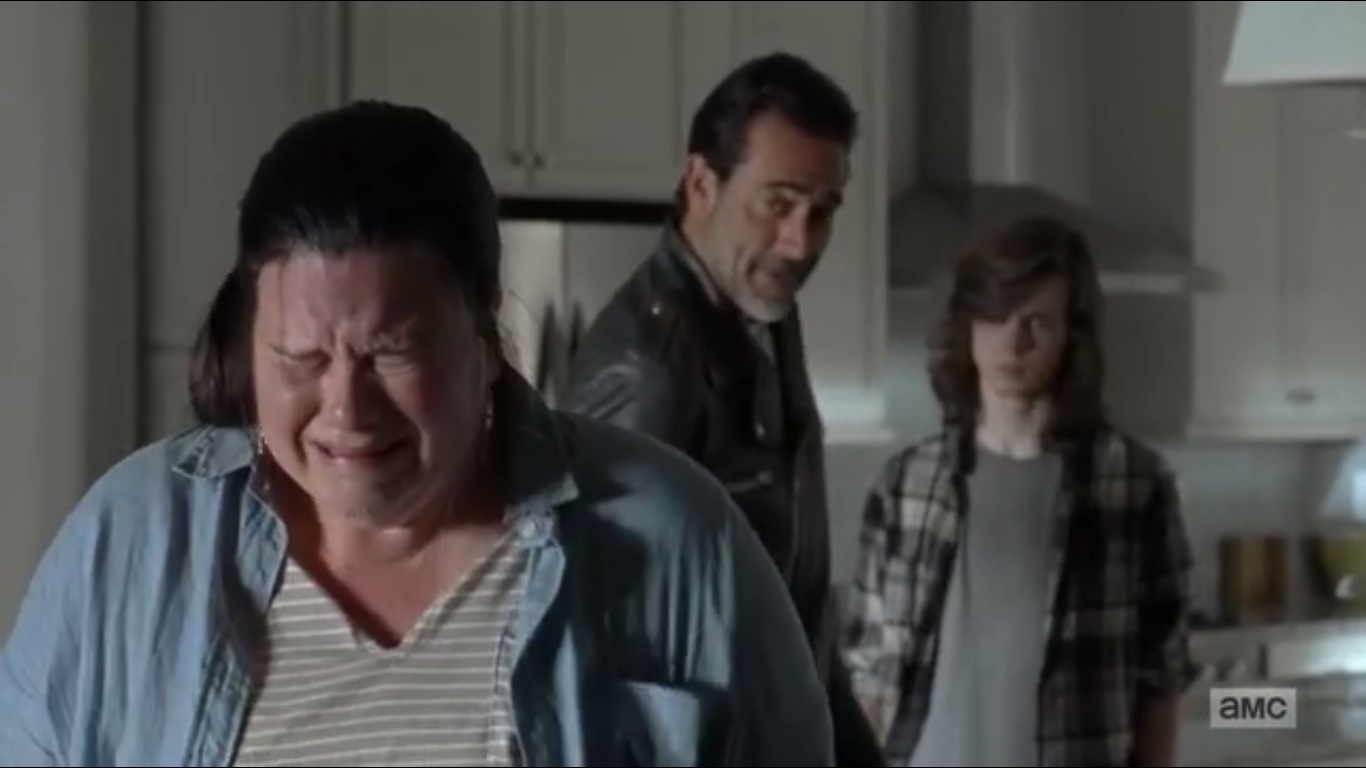 And just where is Negan? Well, he’s back in Alexandria with Carl as he pays Olivia a surprise visit. He wants to speak with Rick, but he’s out scavenging and might not be back today, so Negan will wait. Olivia tells Negan that Alexandria is low on supplies, particularly with food, but Negan takes one look at Olivia and figures can’t be the case for everyone. This makes Olivia cry. A dick comment, but it’s Negan, so I’ll allow it.