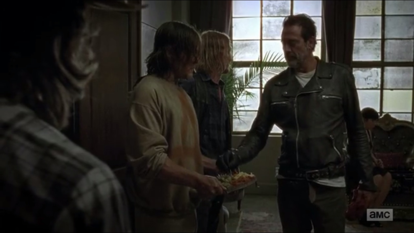 Then Dwight and Daryl just as Negan is kissing Sherry. Daryl, as the help, brings in a plate of food, which is sad to see, I will admit. He demands to know why Carl is here, but that’s none of his business. If Daryl isn’t careful, a toothpick will go through Carl’s good eye. Negan then tells Dwight to fire up the furnace. It’s time for a little déjà vu.