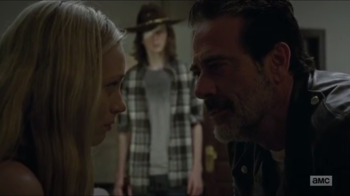 As Dwight takes Daryl instead, Negan laments that he’ll maybe have time to screw just one of his wives today. As for what’s in store for Carl, two things: Carl can’t shatter the badass image that Negan has of him, so Carl can’t show any fear. Second, Negan sure as shit isn’t about to ruin the surprise..