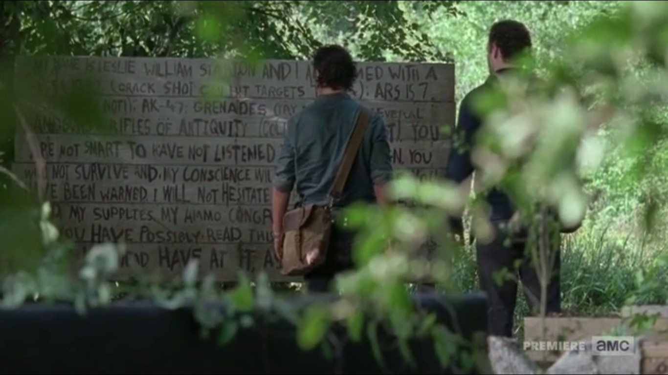 Rick and Aaron- you remember them, right?- happen upon a sign telling them about an armed person who has supplies and ammunition. The only way for someone to have reached this point is that the person who wrote the sign must apparently be dead. Indeed, Rick and Aaron find what looks a houseboat.
