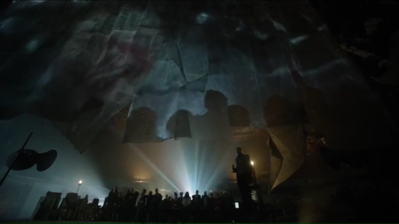 Jim and Bullock, having learned that Dwight used to work at Indian Hill- of course- tail Dwight to an old theater where a crowd has gathered. Dwight takes center stage and rails against Gotham’s finest, calling them slaves who are mentally shackled, but do nothing about it. But there was one fearless man who understood and stood up to the jailers and puppets.
