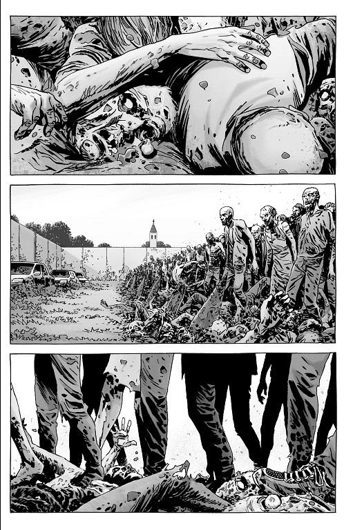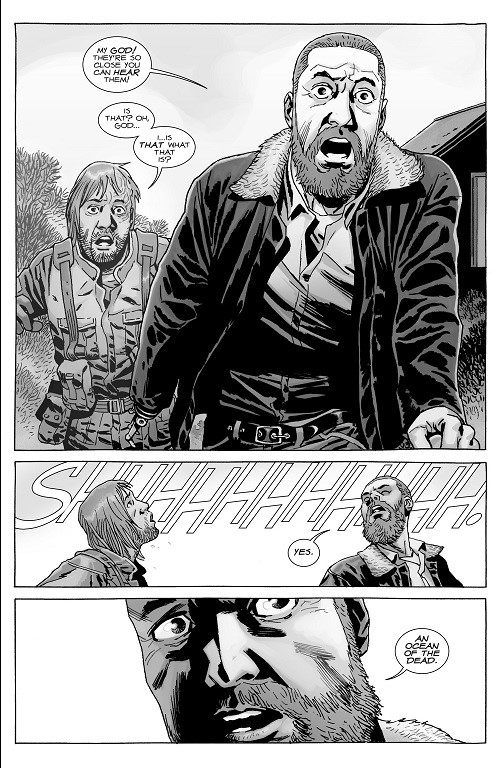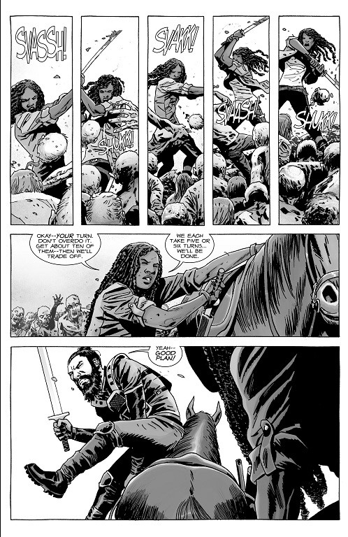 There’s no time to breathe or blink in this issue. Right from the start, Rick and gang are mounting an offensive to stop this oncoming rush of the dead. That by itself is an uphill task, and this herd eclipses what the residents had to deal with back in “No Way Out.” There, the numbers were huge, sure, the survivors could contain and gradually thin out the swarm of roamers. Not so much here.