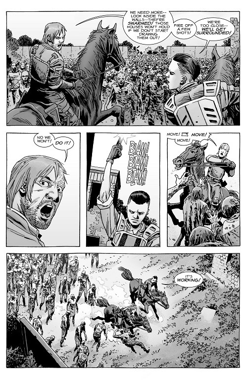 Anyway, the rest of the issue deals with the groups on the outside still drawing away as many roamers as possible, but there are some character moments. We get Eugene and Heath talking about how being outside the walls makes them feel complete. It keeps them busy.