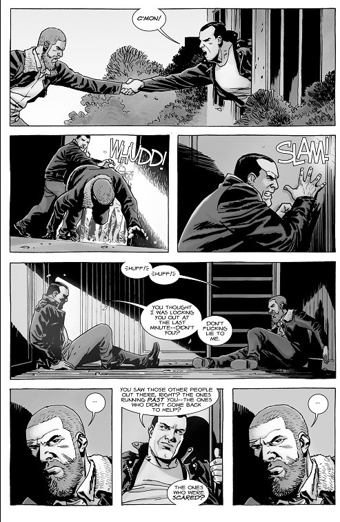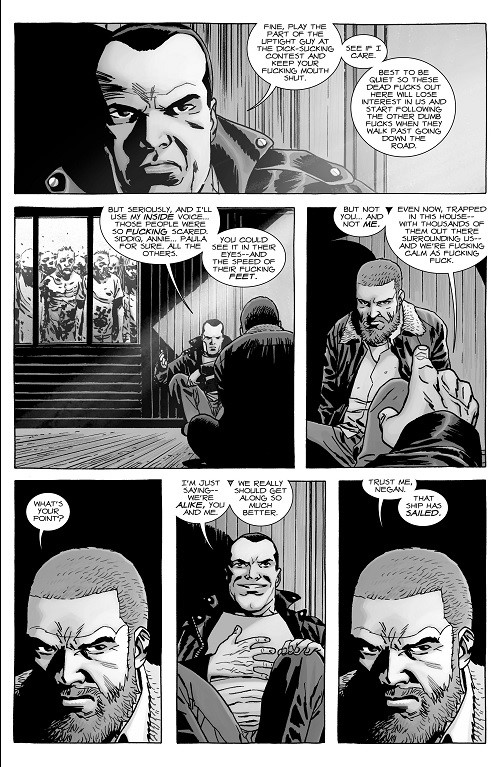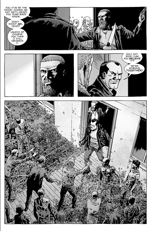 I don’t know if this was an intentional move on Robert Kirkman’s part, but this issue and Negan baring his soul to Rick are both given more weight through “Here’s Negan” and watching him grow increasingly frustrated with the people he ran into getting themselves bitten or killed. You can read and enjoy this without reading “Here’s Negan,” yes, but I think looking at it helps you understand Negan’s case.