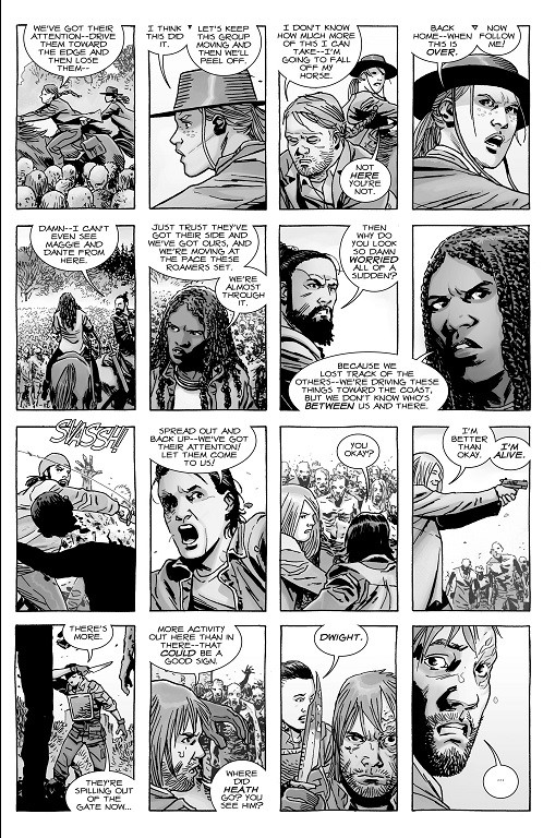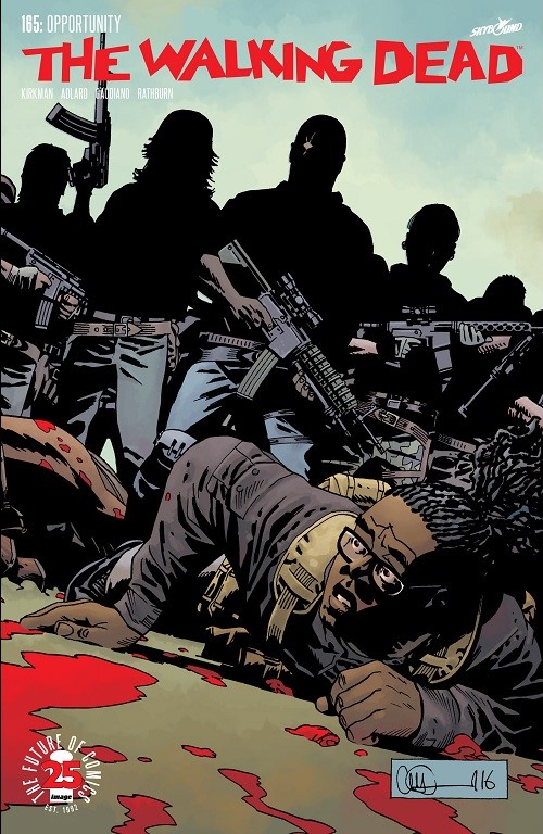 There is a lot going on in issue #165 of The Walking Dead, and that is both a good thing and sort of a bad. Nothing that ruins the issue, mind you, because it was still a great read. But we have several groups in different locations battling the roamer herd at the same time and while Kirkman does take time to show us each group, it felt a bit jumbled at times. Contrast that to “No Way Out,” where you have everyone centralized in Alexandria.