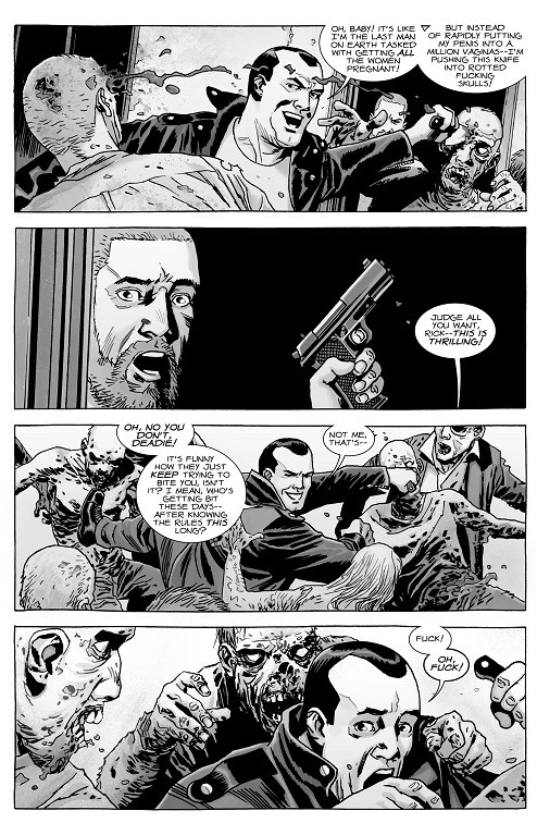 But let’s break the issue down a bit, because the meatier parts come towards the end. We have Rick and Negan continuing to clear the way so they can escape the house, with Negan almost getting bitten and overtaken by roamers. This is Negan, though. His time has not yet come. But one thing’s funny: he says “Who’s getting bit these days– after knowing the rules this long?” More on that later.