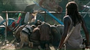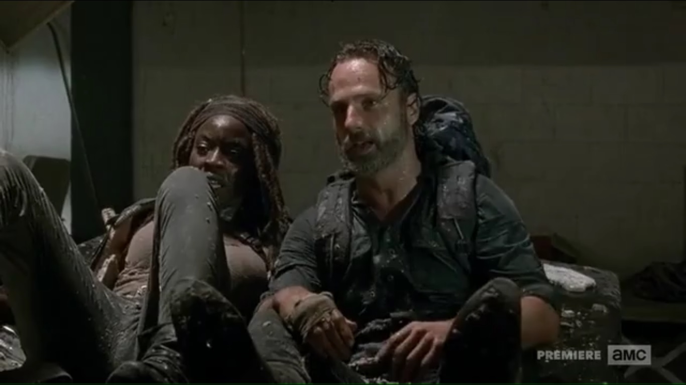 Nah, Rick has his dumpster moment and emerges from hiding and snaps Michonne out of her temporary funk. The two hack through the remaining walkers and soon pack up all the weapons that they can grab.