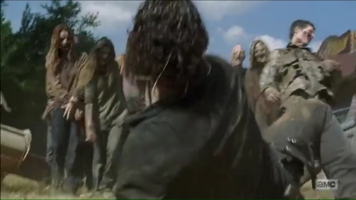 Walkers soon surround the car, but the two climb out and cut down as many walkers as they can until the walker pack tears through the fence. Rick and Michonne retreat note that they could just leave, but this can work. Besides, they cut through the walkers with ease.